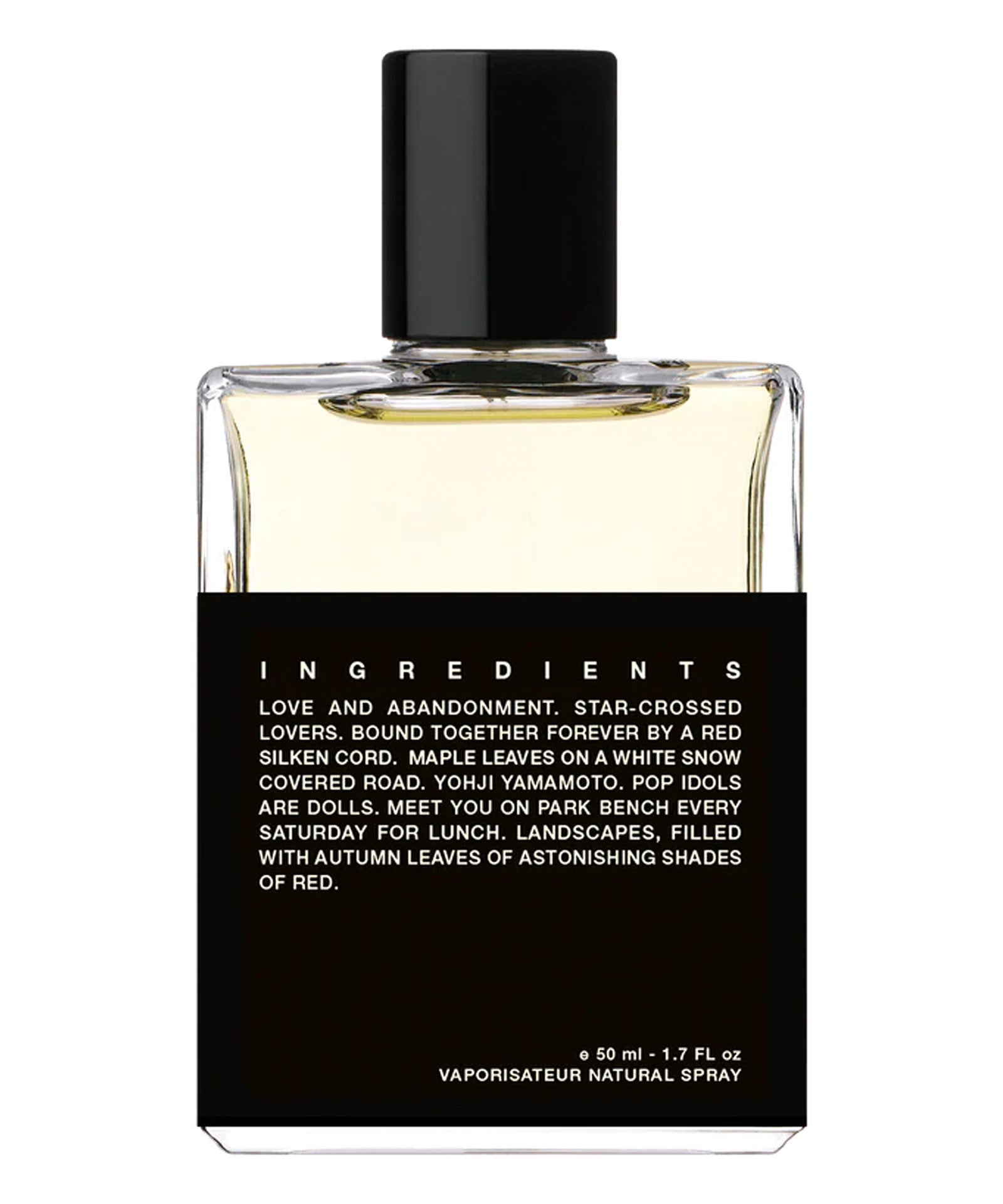 Una fragranza dai colori vividi e stravaganti e una storia irrealistica di un amore senza compromessi, che consuma tutto e rasenta la follia. Un profumo pesante, basato su note animalesche interrotte dall'odore sottile e leggero della neve; così ripugnante nell'odore, così attraente nei colori, così irreale.